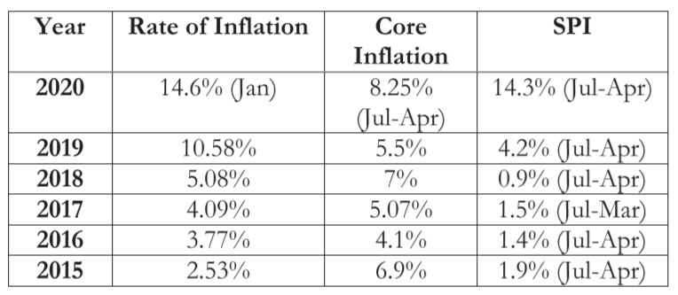 Before making a shabby claim, attached below is a table that details the rate of inflation, core inflation and sensitive price index in the past five years. A cursory look at the table above presents a clear indication to the sudden rise in inflation during the year 2020.