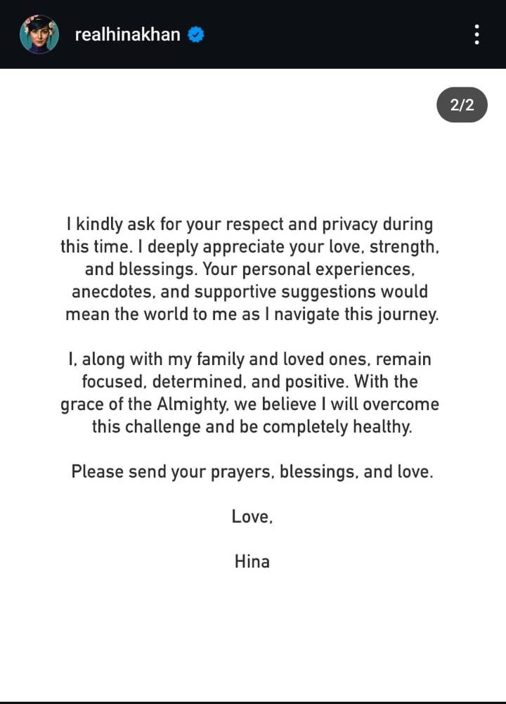 She continued, “I kindly ask for your respect and privacy during this time. I deeply appreciate your love, strength, and blessings. Your personal experiences, anecdotes, and supportive suggestions would mean the world to me as I navigate this journey. I, along with my family and loved ones, remain focused, determined, and positive. With the grace of the Almighty, we believe I will overcome this challenge and be completely healthy. Please send your prayers, blessings, and love. Love, Hina.”