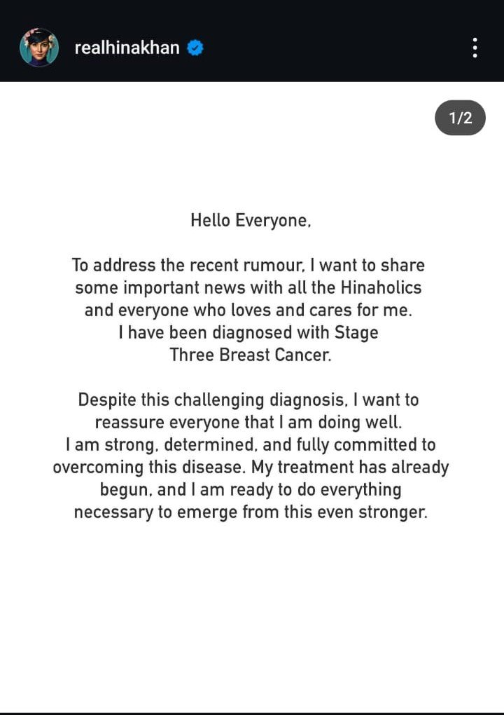 “Hello Everyone, To address the recent rumors, I want to share some important news with all the Hinaholics and everyone who loves and cares for me. I have been diagnosed with Stage Three Breast Cancer. Despite this challenging diagnosis, I want to reassure everyone that I am doing well. I am strong, determined, and fully committed to overcoming this disease. My treatment has already begun, and I am ready to do everything necessary to emerge from this even stronger,” Hina wrote on Instagram.