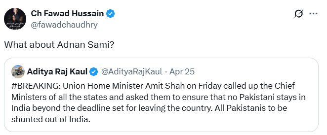 Taking a swipe at the move, Fawad posted on X (formerly Twitter), “What about Adnan Sami?”—implying that the singer, who renounced his Pakistani citizenship to become an Indian citizen, might also be asked to leave.