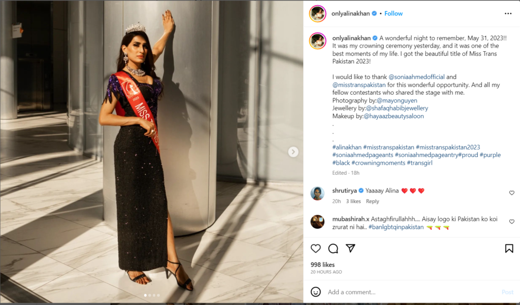 Khan posted a picture of herself wearing the sash and tiara on Instagram and captioned it: “A wonderful night to remember, May 31, 2023!! It was my crowning ceremony yesterday, and it was one of the best moments of my life. I got the beautiful title of Miss Trans Pakistan 2023!”