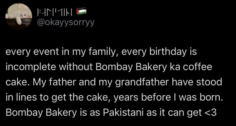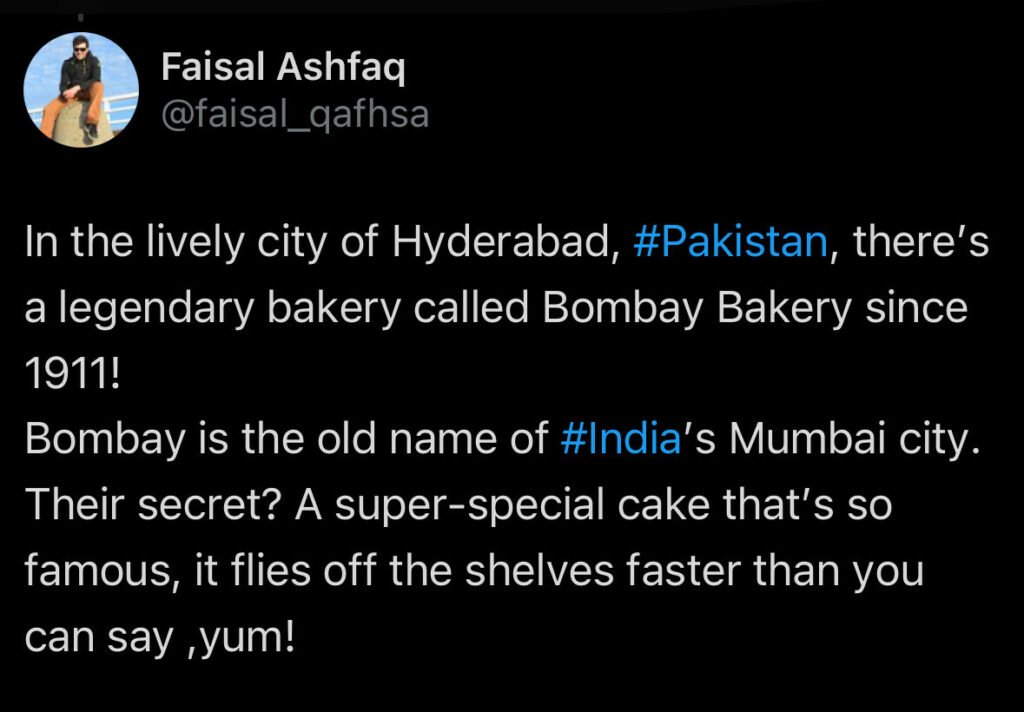 In stark contrast, Pakistanis took to social media to express admiration for Bombay Bakery — a century-old institution in Hyderabad, Pakistan. Known for its iconic coffee cake, Bombay Bakery has developed a cult following across generations.