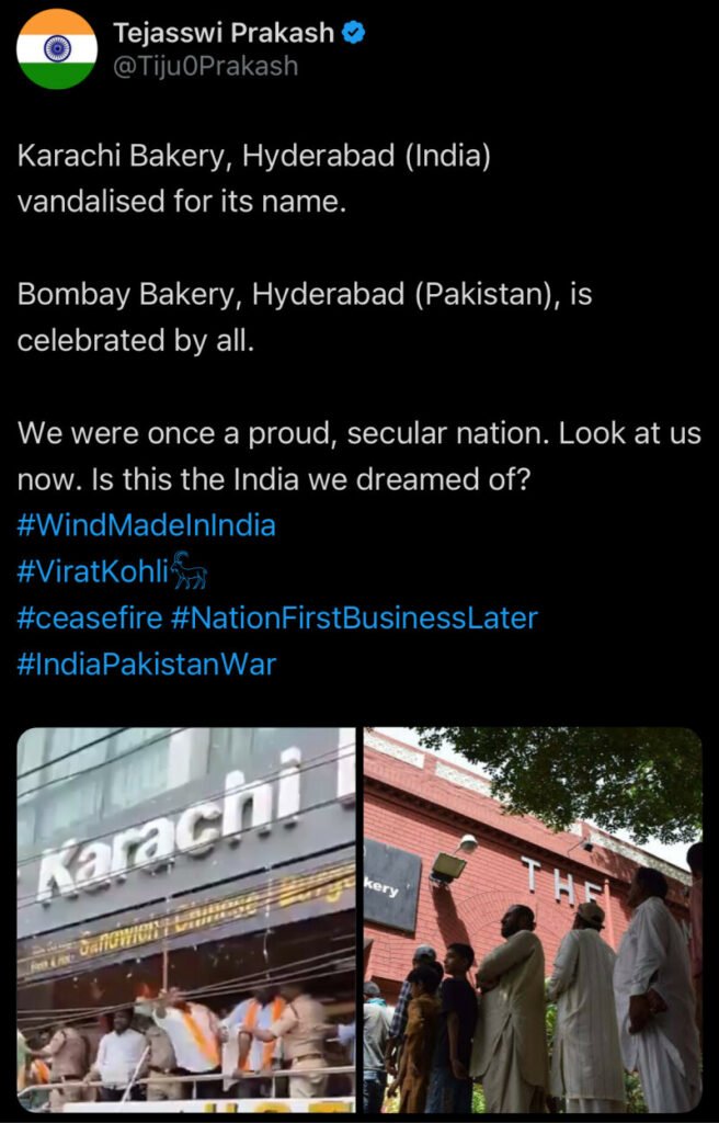 Following a disturbing incident in Hyderabad, India, where members of Prime Minister Narendra Modi’s Bharatiya Janata Party (BJP) vandalised the renowned Karachi Bakery over its name, Pakistanis have responded in a markedly different way — by expressing deep appreciation for their own beloved bakery, the legendary Bombay Bakery in Hyderabad, Pakistan.