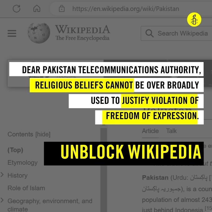 “We are alarmed about the blanket #Wikipediablock implemented by the Pakistan Telecommunication Authority (PTA) on 4 Feb. This amounts to an unjustifiable restriction on the right to freedom of expression and must be reversed immediately and unconditionally. (1/3)