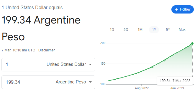 In March 2022, Argentina’s Peso was trading around 100 versus the US dollar.