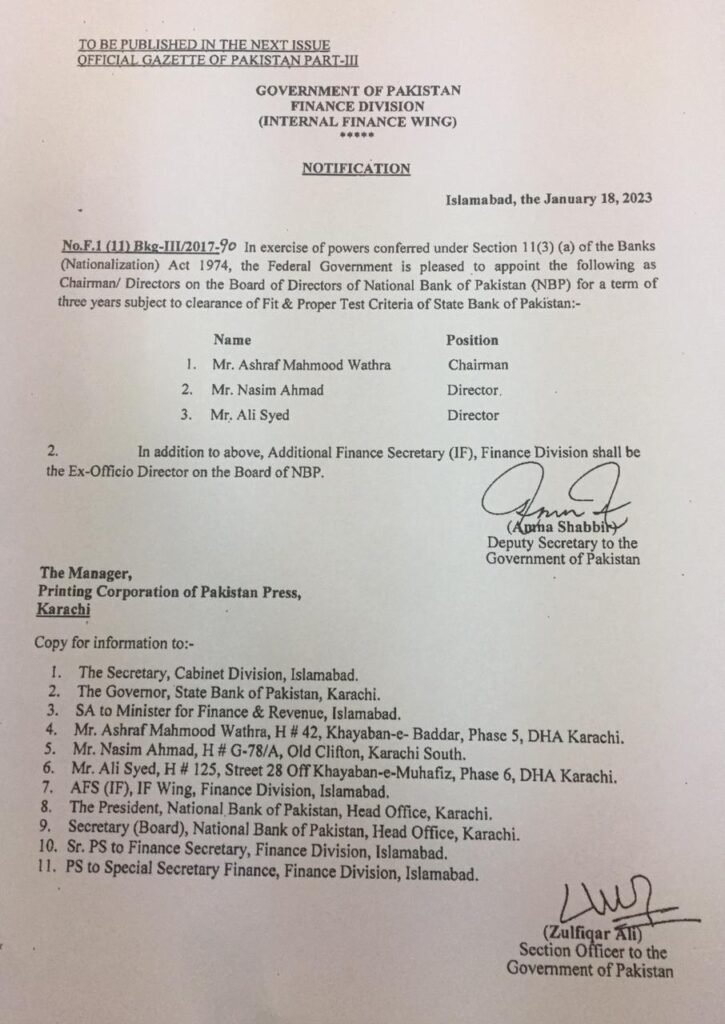 According to the Finance division notification, the government appointed Arshaf Mahmood Wathra as Chairman, besides Nasim Ahmad and Ali Ayed as member Boardof Directors of NBP for a term of three years subject to clearance of Fit and Proper Test Criteria of SBP.