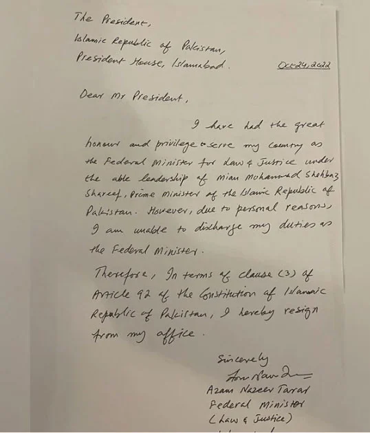 Azam Nazeer Tarar, the federal law minister, resigned from his post on Monday.