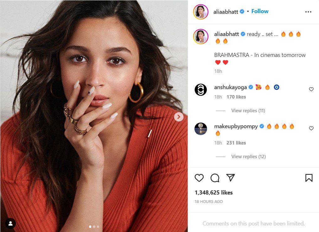 With numerous heart and fire emoticons, she captioned the photo, “Ready. Set…Brahmastra- In cinemas tomorrow.”