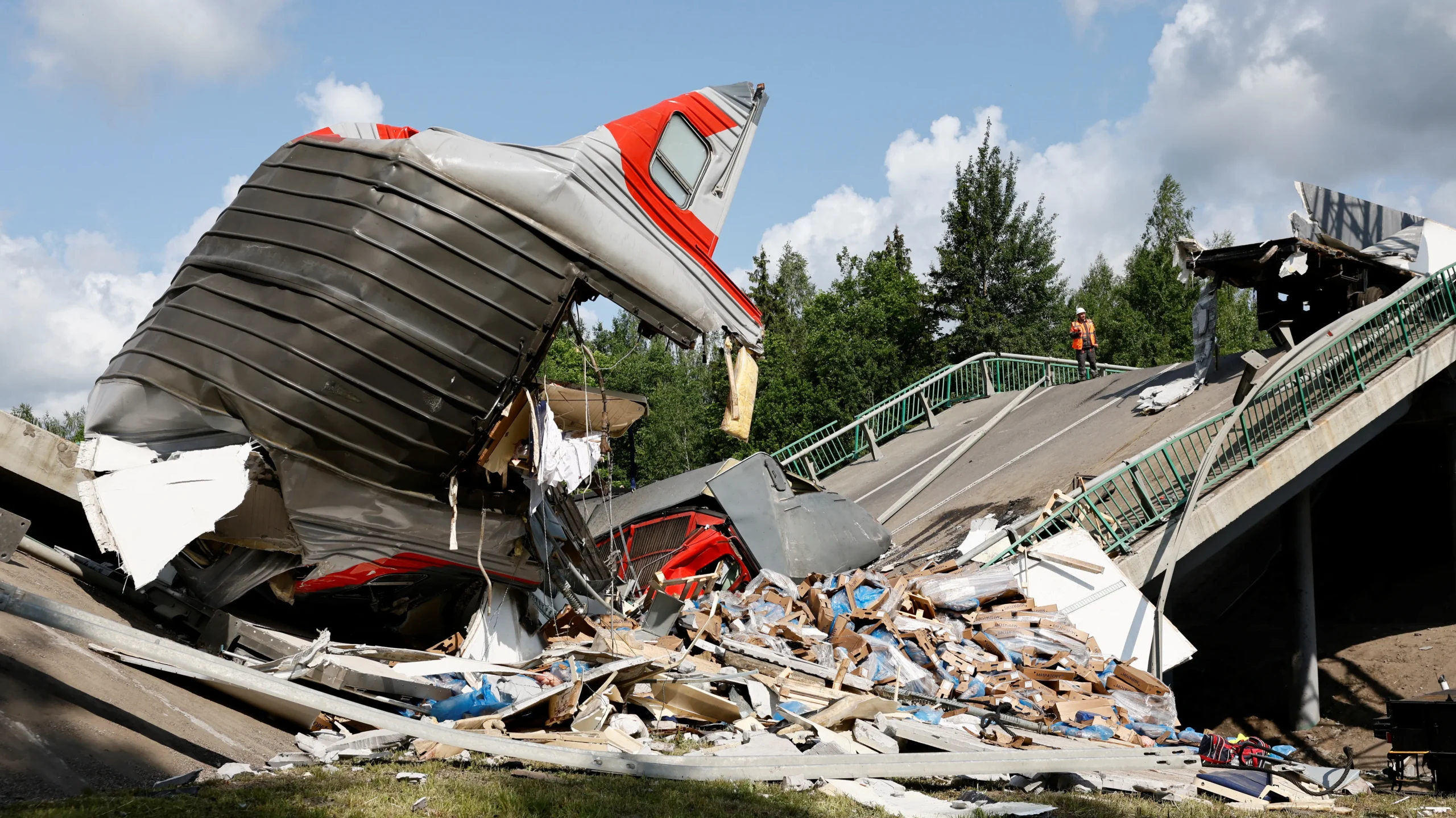 Dramatic images and footage circulated on Russian social media platforms showed wrecked carriages and dazed passengers attempting to climb out of the debris in darkness. The impact left several train cars mangled, with some trapped under the rubble of the collapsed road bridge.