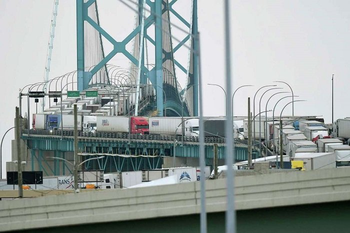 Late on Monday, trucks began obstructing traffic on the Ambassador Bridge, which connects Lake Erie and Lake Huron.