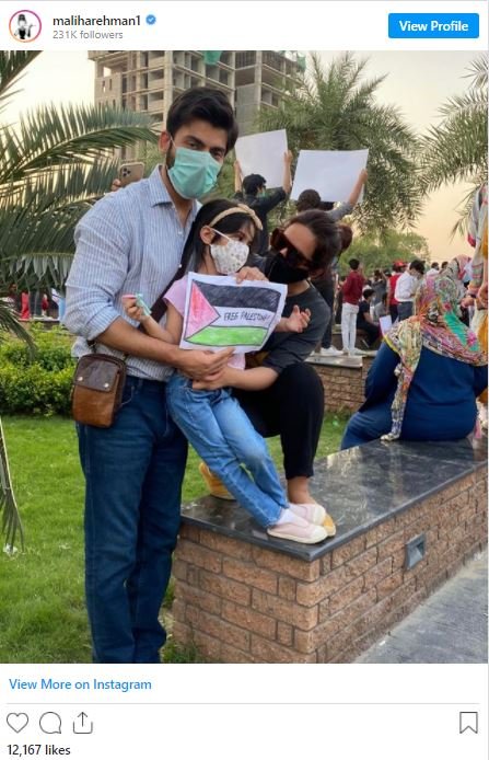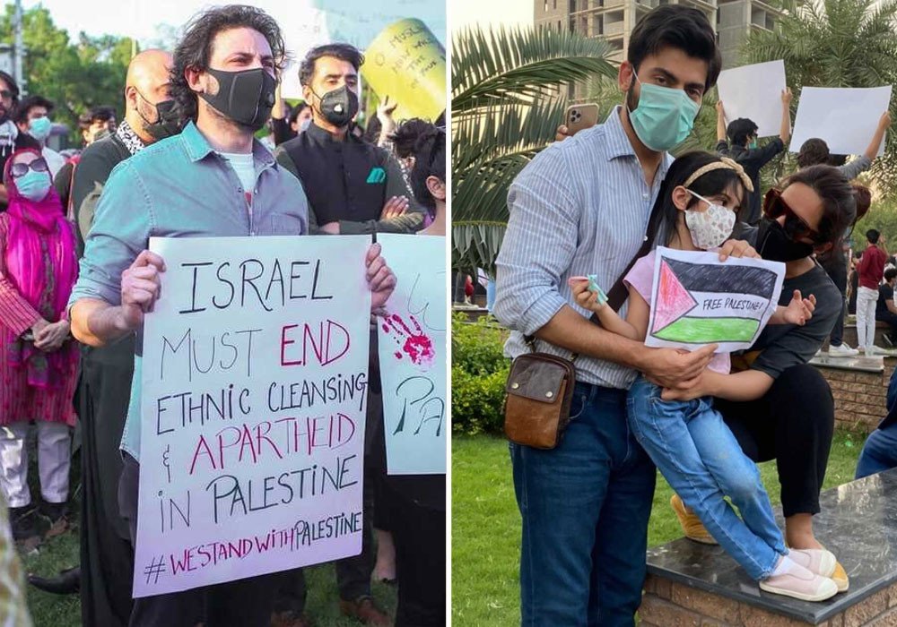 The famous names like the heartthrob Fawad Khan staged his protest against Israeli brutality and showed solidarity with innocent Palestinian people by participating in a public rally in Lahore. The versatile star was accompanied by his wife Sadaf and daughter.