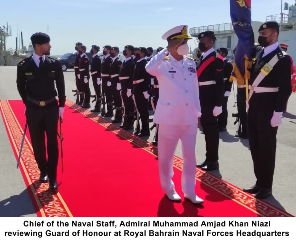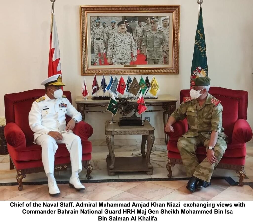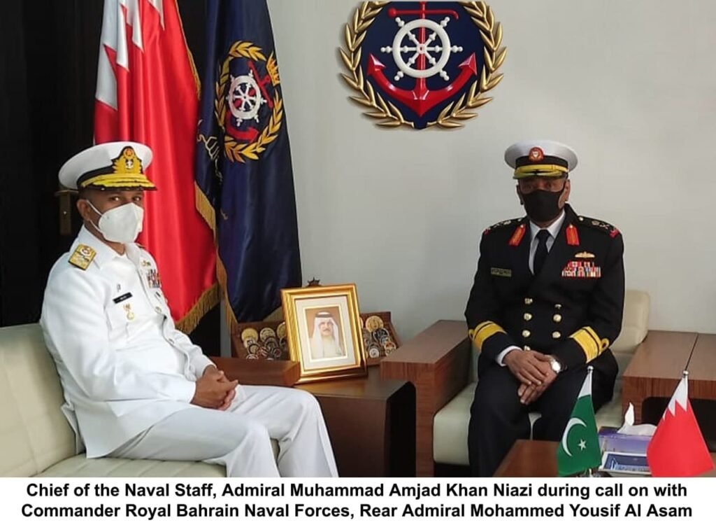 Chief of the Naval Staff Admiral Muhammad Amjad Khan Niazi is on official visit to Bahrain. During the visit, the Naval Chief called on Commander-in-Chief Bahrain Defence Forces (BDF) H.E Field Marshal Shaikh Khalifa Bin Ahmed Al Khalifa, Commander Bahrain National Guard (BNG) His Royal Highness Major Gen Sheikh Mohammed Bin Isa Bin Salman Al Khalifa, Commander Royal Bahrain Naval Forces (RBNF) Rear Admiral Mohammed Yousif Al Asam and Deputy Commander US NAVCENT Rear Admiral Curt Renshaw, in separate meetings.