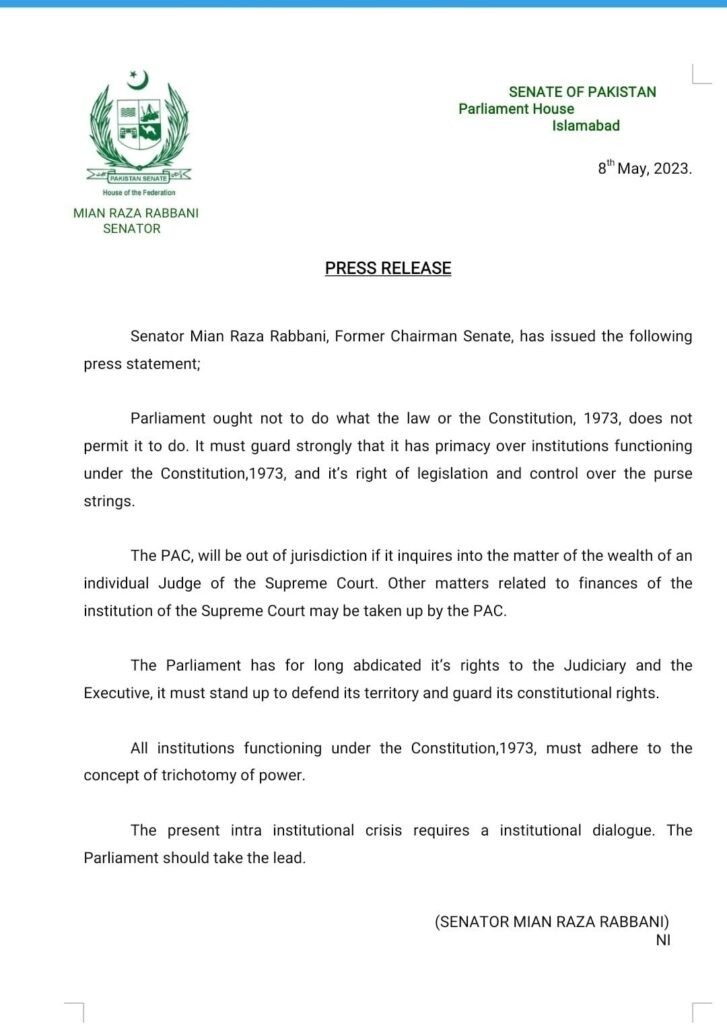 Former chairman Senate Senator Raza Rabbani has criticized the PAC’s move, stating that it would be out of jurisdiction if it inquires into the wealth of an individual judge of the Supreme Court. He suggested that the PAC could address other matters related to the finances of the institution of the Supreme Court. Rabbani emphasized the importance of adhering to the concept of trichotomy of power and called for an institutional dialogue to address the current intra-institutional crisis.