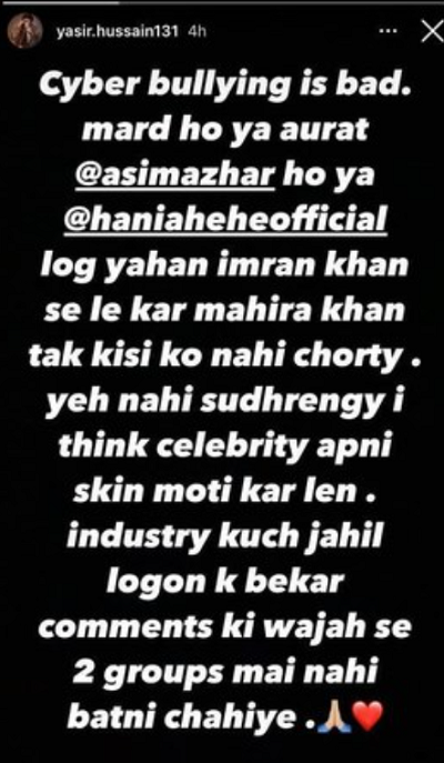 “Cyber bullying is bad, mard ho ya aurat Asim Azhar ho ya Hania Aamir, log yahan Imran Khan se le kar Mahira Khan tak kisi ko nahi chortay [Cyber bullying is bad regardless of whether its a man or woman, Asim Azhar or Hania Aamir. From Imran Khan all the way to Mahira Khan, no one is spared here],” he wrote.