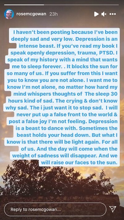 “I speak of my history with a mind that wants me to sleep forever. It blocks the sun for so many of us,” continued McGowan, who had shed light on her fight with depression trauma, and PTSD in her 2018-released memoir, Brave.
