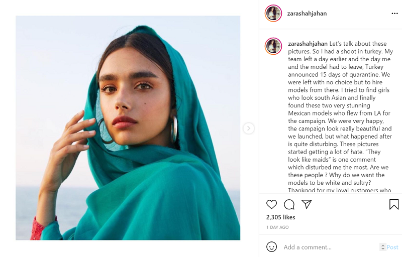 She said, “I tried to find girls who look South Asian and finally found these two very stunning Mexican models who flew from LA for the campaign. We were very happy, the campaign look really beautiful and we launched, but what happened after is quite disturbing.