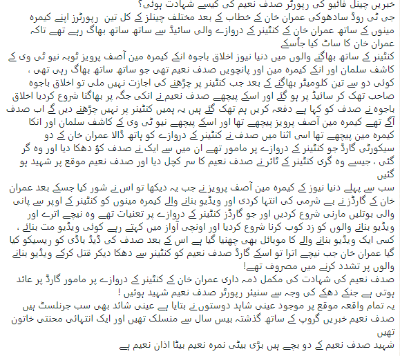 According to the message, instead of helping journalists, the security guards of PTI started manhandling the TV reporters, and cameramen and tried their best that they could not make videos of Sadaf Naeem who was crushed under the wheels of the container. The TV journalists, including cameramen, have blamed the security guards of PTI for the tragic death of Sadaf Naeem. Female TV reporter Sad had been working with Khabrain media group for the past two decades and she was known as a hard-working journalist. TV Channel-5 is also a subsidiary of this media group.