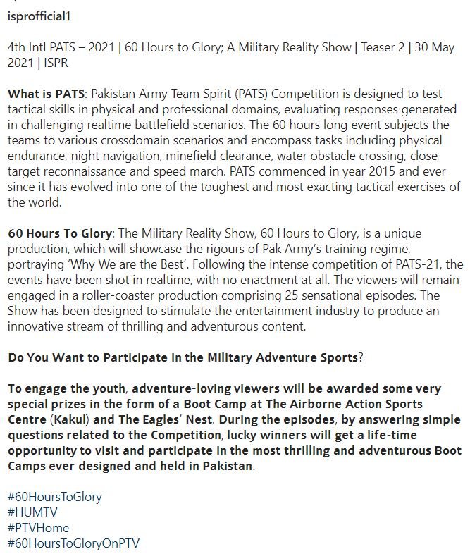 On ISPR’s official Instagram page, the complete information is given regarding the shows, Pakistan Army Team Spirit (PATS), and how any youth can engage and get a chance to win an opportunity in a form of a Bootcamp at The Airborne Action Sports Centre (Kakul) and the Eagles’ Nest.