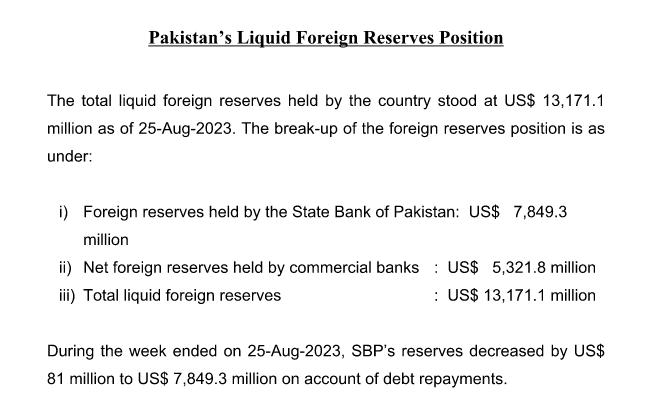 The reserves with the SBP are at $7.849 billion and $5.321 billion reserves are with the commercial bank as of August 25, 2023.