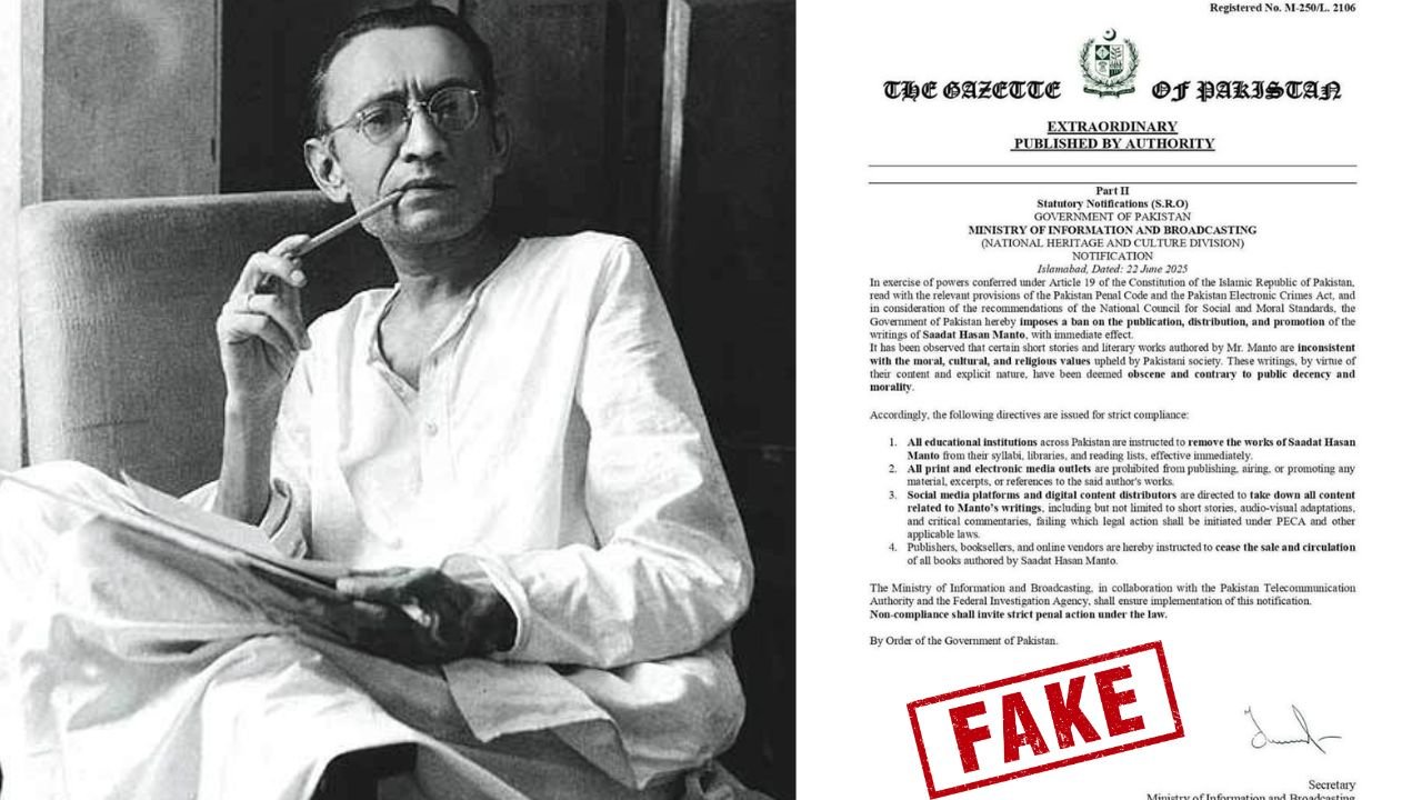 A notification circulating widely on social media claims that the federal government of Pakistan has imposed a ban on the publication, distribution, and promotion of the literary works of renowned writer Saadat Hasan Manto.