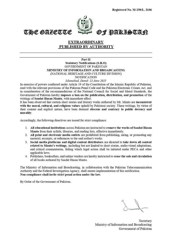 The document, which surfaced on WhatsApp groups and has also been shared across X (formerly Twitter), appears to bear the official seal and signature of the secretary of the information ministry. It claims the action was taken under the Pakistan Electronic Crimes Act, suggesting that Manto’s content violates national standards of decency and public morality.