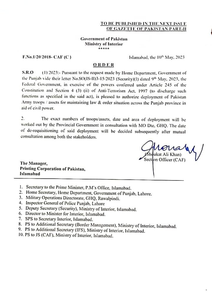 Earlier, the Home Department of the Punjab government was the first one to formally request the federal government for immediate deployment of military personnel in the province to assist police and rangers to maintain peace as riots are being reported in different areas after the arrest of former prime minister Imran Khan.