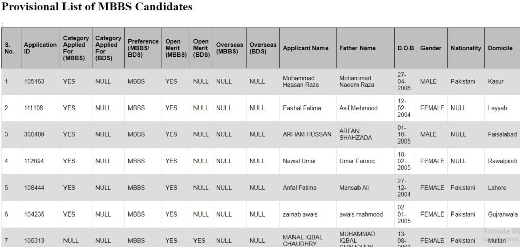 Mohammad Hassan Raza, Eashal Fatima, Arham Hussain, Nawal Umar, Anfal Fatima, Zainab Awais, Manal Iqbal Chaudhry, Dilawar Ali Khan, Muhammad Talha, Rania Usman Latif, Asmaa Khalid and Mahnoor Shujaat are the top-12 candidates who have passed the MBBS test.