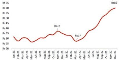 The price of a dozen eggs has risen by more than Rs100 in the last year.