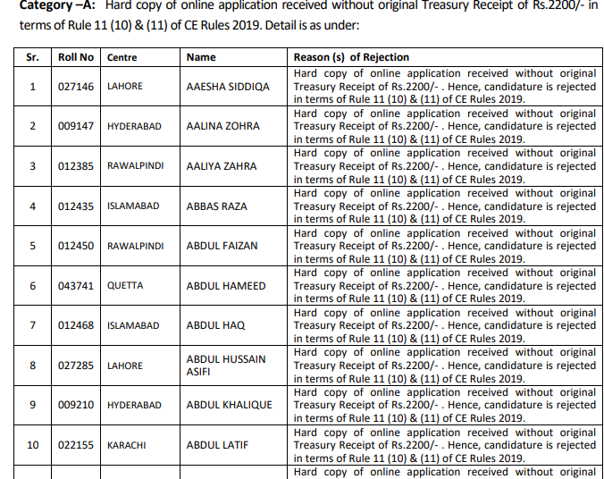 Here is the link of the Federal Public Service Commission’s website carrying names of 2,415 candidates who applications have been rejected due to different reasons. Hence, candidature is rejected in terms of Rule 11 (10) & (11) of CE Rules 2019. The CSS aspirants and the candidates who have been declared ineligible can go through the link below to see the reasons which disqualifies them for taking CSS exams.