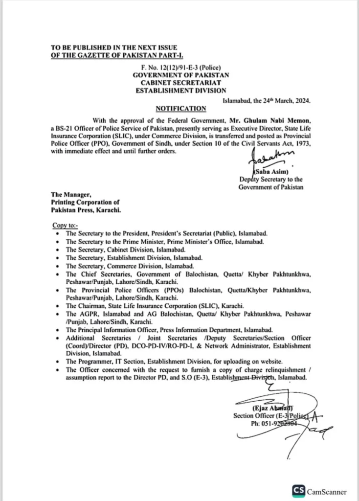 According to a notification issued by the Establishment Division, Memon’s appointment as the Provincial Police Officer (PPO) of Sindh, under Section 10 of the Civil Servants Act, 1973, is effective immediately and until further orders.