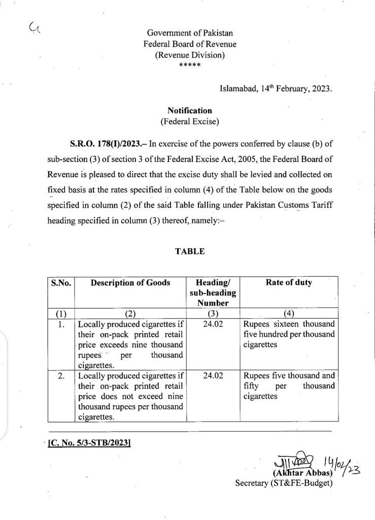 The Federal Board of Revenue (FBR) has issued a notification to increase tax rate in cigarettes and luxury items to meet another condition of the IMF.