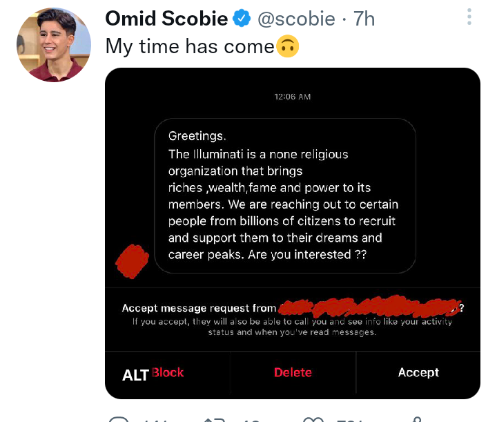 On Tuesday, Omid Scobie, the biographer of Meghan and Harry, posted a screenshot of a message he received from “The Illuminati” along with a humorous description.