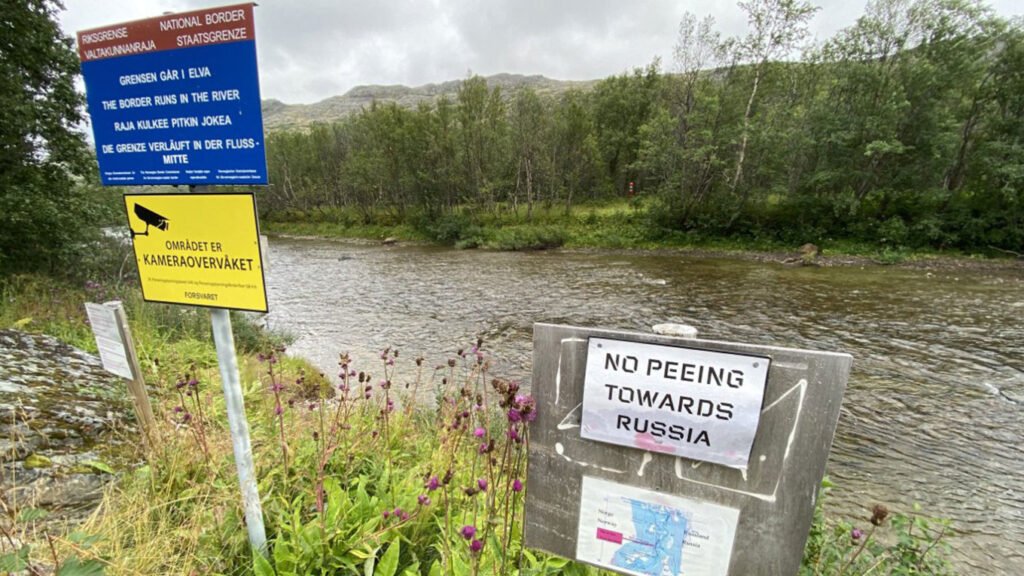 Written in English in black block letters, the sign posted on the banks of the Jakobselva river that separates Norway from Russia reads: “No Peeing Towards Russia”.