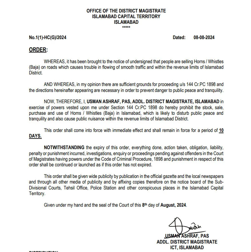 The notification outlines that the stock, sale, purchase, and use of these toy horns are now prohibited throughout Islamabad.