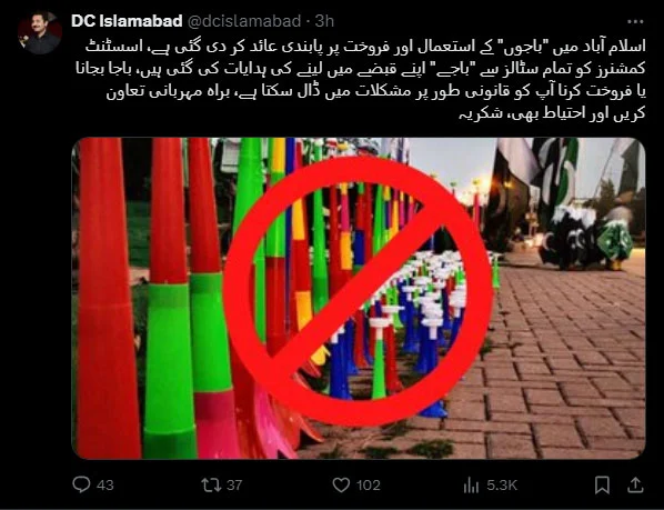 In conjunction with the notification, Islamabad’s Deputy Commissioner, Irfan Nawaz, has urged residents to refrain from using these toy horns and has instructed stall owners to cease their sale.