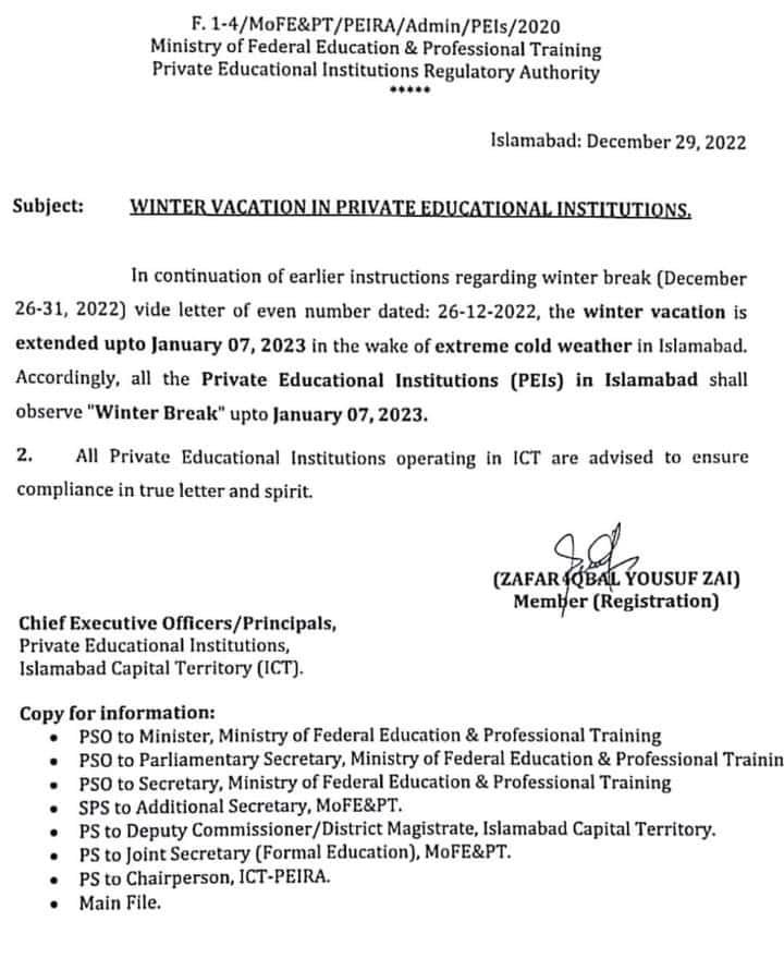 The Ministry also directed Islamabad’s Private Educational Institutions (PEIs) to extend the winter break and ensure that the most recent instructions were followed in full.