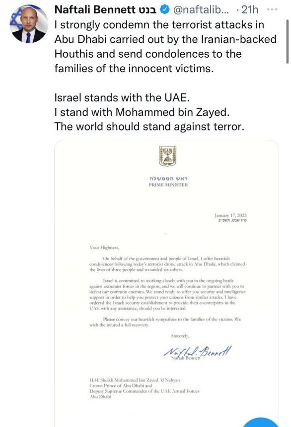Bennett emphasised Israel stands ready to provide UAE with security and intelligence support to assist them in protecting their people against similar assaults. He said that he has directed the Israeli security network to help their colleagues in the UAE if the UAE government is interested.