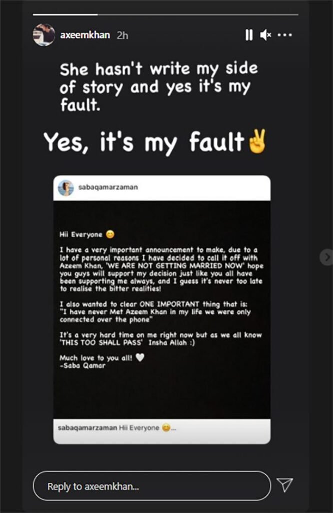 Khan shared the statement of Saba Qamar on his Story and reacted “She hasn’t write my side of story and yes it’s my fault.”
