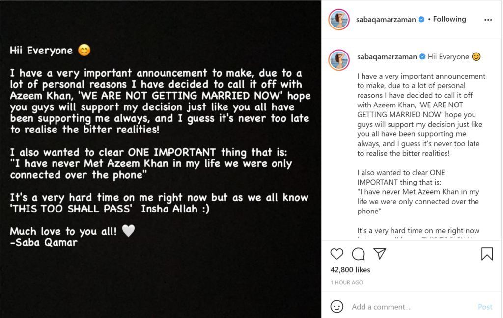 Saba Qamar statement reads: “Hii Everyone. I have a very important announcement to make, due to a lot of personal reasons I have decided to call it off with Azeem Khan.”