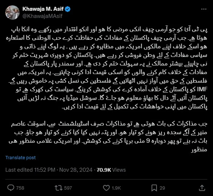 Asif also accused PTI of hypocrisy in its dealings with Pakistan’s military establishment. He stated that PTI leaders were willing to engage in negotiations with Army Chief General Asim Munir when they saw an advantage, but when negotiations failed, they resorted to disruptive tactics, including inciting chaos similar to the violent May 9 protests.