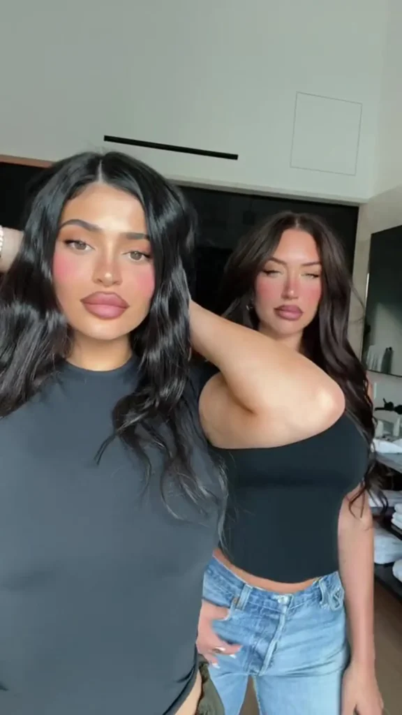 In the video, both women are seen applying the same dark lip liner and lipstick, giving their lips a bigger, more dramatic appearance.