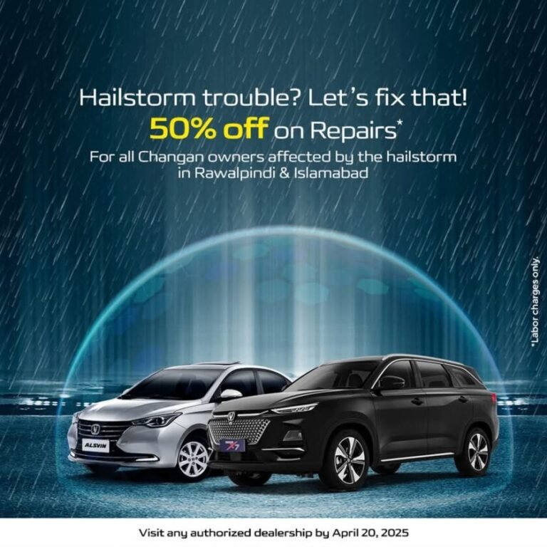 Changan Pakistan has introduced a 50% discount on labour charges for all hailstorm-related repairs. This applies to: