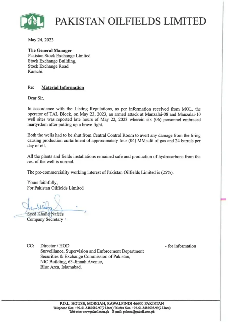 The Manzalai-08 and Manzalai-10 well locations in Hangu District had their production temporarily shut down, according to MOL Pakistan Oil and Gas Company.