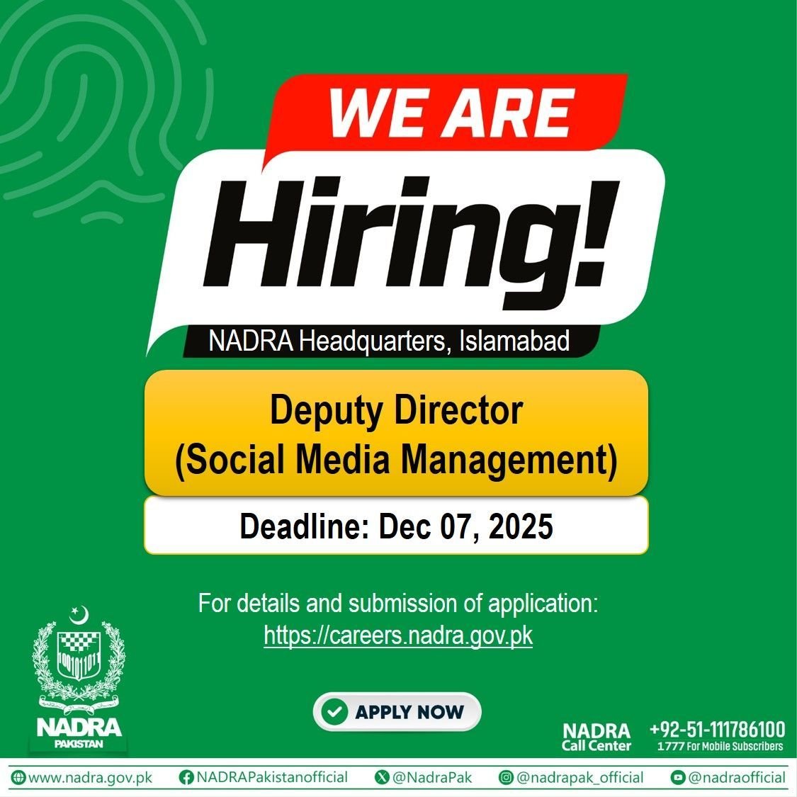 On Thursday, Nov 27, NADRA announced the vacancy of Deputy Director, Social Media Management. NADRA has set December 7 as the deadline to receive applications for this important position. The Authority has shared further details on its website about the requirements for the Deputy Director, Social Media Management position.