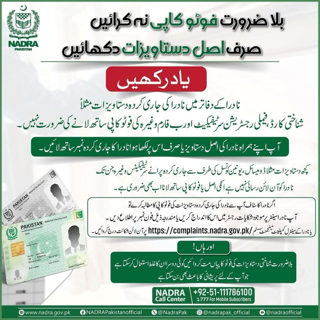 The National Database and Registration Authority (NADRA) has issued an important public advisory urging Pakistani citizens to refrain from making unnecessary photocopies of their official documents.