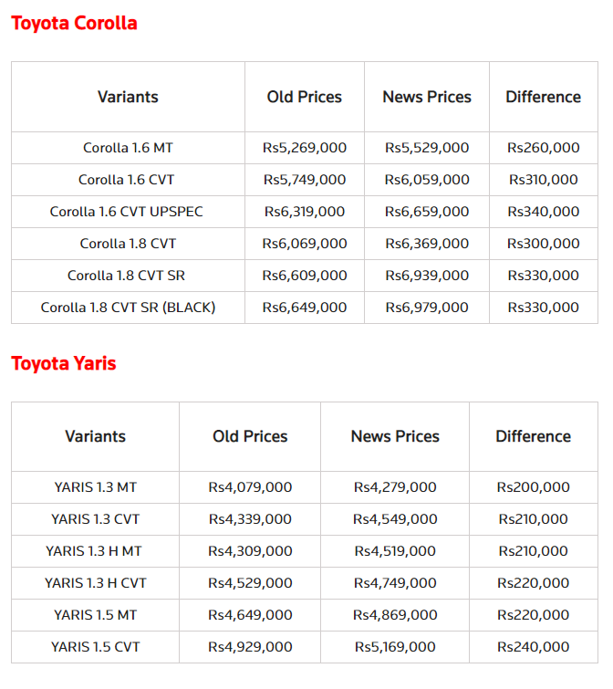 The Corolla 1.6 MT, 1.6 CVT, 1.6 CVT Upsspec, 1.8 CVT, 1.8 CVT SR, and 1.8 CVT SR BLK now cost Rs5.529m, Rs6.059m, Rs6.659m, Rs6.369m, Rs6.939m, and Rs6.979m, respectively.