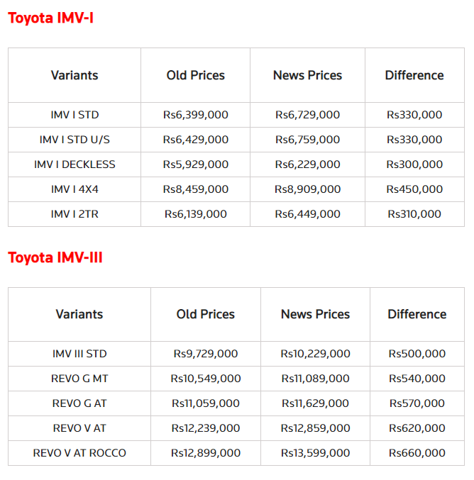 The Hilux STD, STD U/S, Deckless, 4×4, and ZTR have increased in price by Rs. 310,000-450,000.