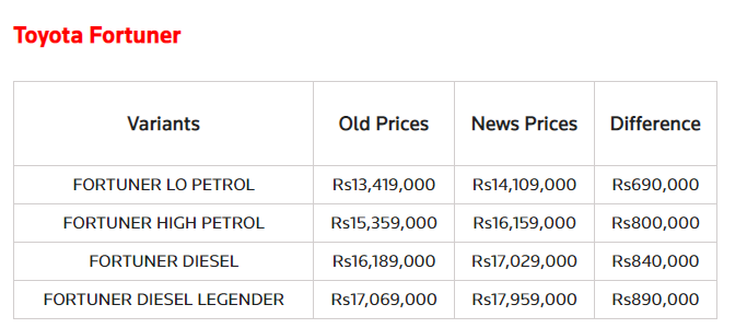 Fortuner LO Petrol, High Petrol, Diesel, and Diesel Legender prices have increased by Rs 690,000-$890,000 to Rs14.109m, Rs16.159m, Rs17.029m, and Rs17.95m, respectively, from Rs13.41v9m, Rs15.459m, Rs16.189m, and Rs17.069m.
