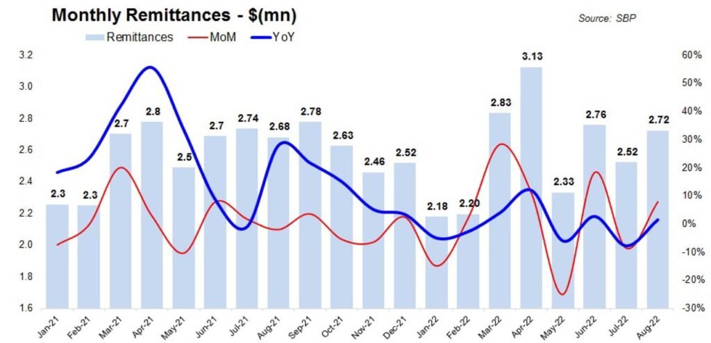 Remittances were expected to climb by roughly 8 percent month-over-month in August 2022, but annual inflows were down by 1.5 percent compared to August 202.