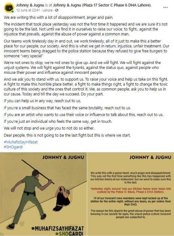 Prior to the incident, some police officers visited the eatery ‘Johnny and Jugnu’ located in DHA Phase-6 and attempted to get burgers free of charge. However, upon refusal, the police officers left in a rage and returned late on Friday night only to arrest the entire crew of the restaurant for reasons that the outlet described as “baseless and unjust”.